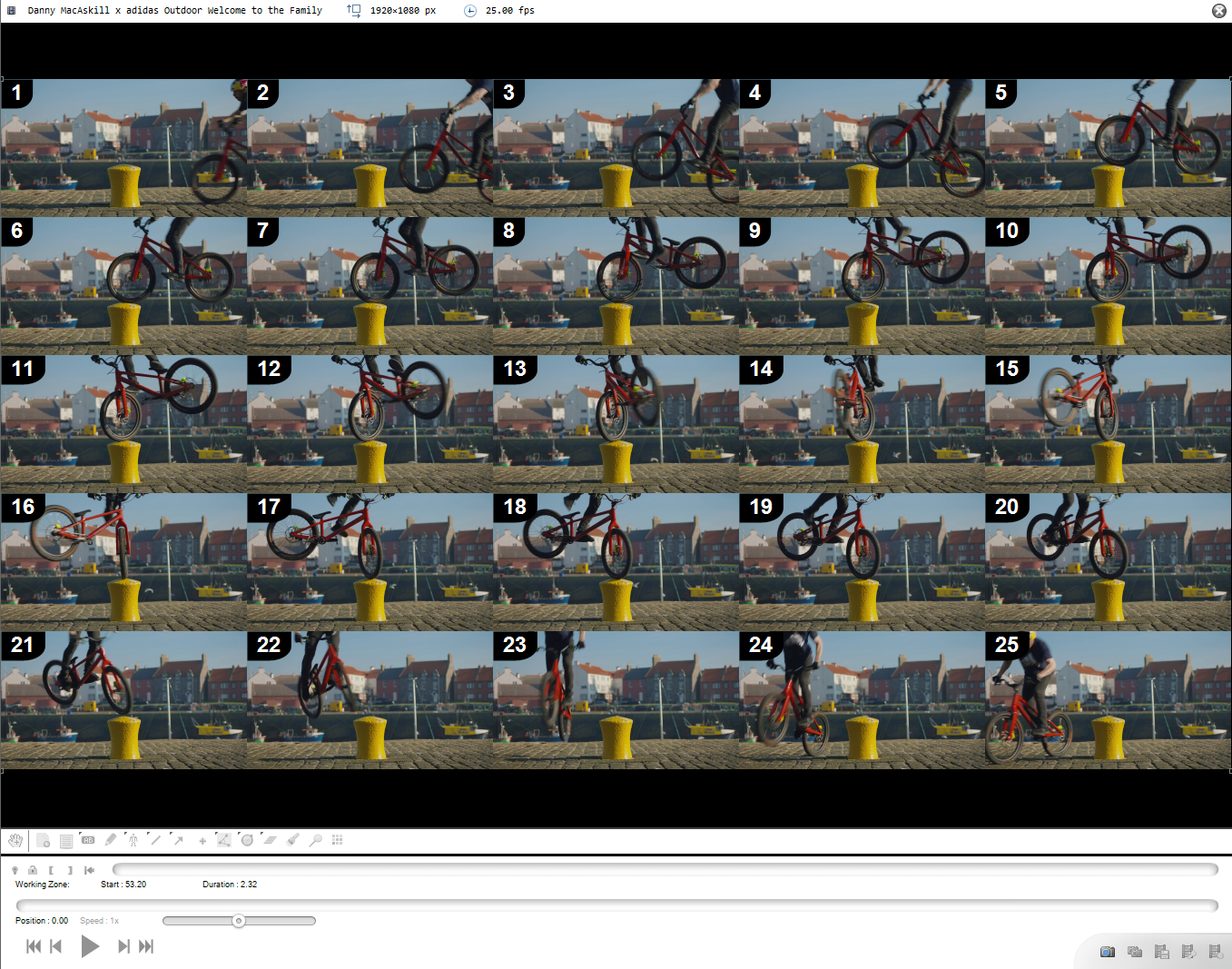 When the Overview mode is active the main image viewport displays a collection of frames taken from the video at regular intervals. The playback controls are disabled.